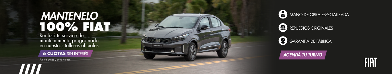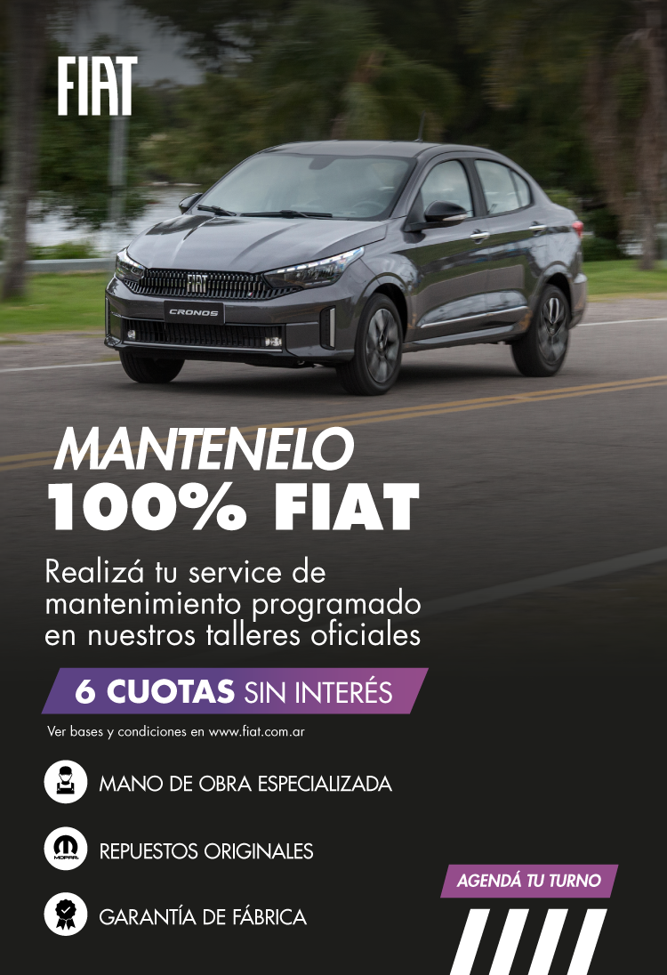 Vehículos comercializados en la República Argentina por FCA AUTOMOBILES ARGENTINA S.A., con domicilio en Carlos María Della Paolera 265, Piso 22, CABA (1001). CUIT 30-68245096-3. Precios válidos para servicios comercializados exclusivamente por los concesionarios y talleres autorizados de la Red FIAT en la República Argentina, desde el 1/9/2025 hasta el 30/9/2025. Vencido el plazo, se aplicará el precio de lista vigente. Mantenimiento programado es el servicio periódico que recomienda el fabricante y que está detallado en el manual del usuario. Debe realizarse cada cierta cantidad de kilómetros o tiempo para asegurar el buen funcionamiento, la seguridad del vehículo y mantener la garantía de fábrica. No están incluidos los servicios que requieran cambio de correa de distribución, bujías, aceite de caja automática y/o correa de órganos auxiliares. El reemplazo de estas piezas debe realizarse según el plazo o el kilometraje que ocurra primero, de acuerdo con lo establecido en el manual de mantenimiento del vehículo. Para obtener un presupuesto, por favor, consulte con el concesionario. La financiación de hasta 6 cuotas sin interés aplica exclusivamente a los servicios de mantenimiento programado realizados en la red de concesionarios y talleres autorizados FIAT de la República Argentina. Esta financiación se aplica sobre el precio de lista vigente al momento de la contratación y podrá utilizarse únicamente con tarjetas de crédito emitidas por entidades bancarias, Mercado Pago y Payway. No acumulable con otras promociones. El servicio es intransferible y solo aplicable al vehículo indicado en la contratación. El servicio no es reembolsable. Podrá reprogramarse una (1) vez dentro de los 90 días posteriores a la compra, sujeto a disponibilidad del concesionario. Para conocer los precios sugeridos al público, ingrese en www.fiat.com.ar o comuníquese gratuitamente al 0800-777-8000.